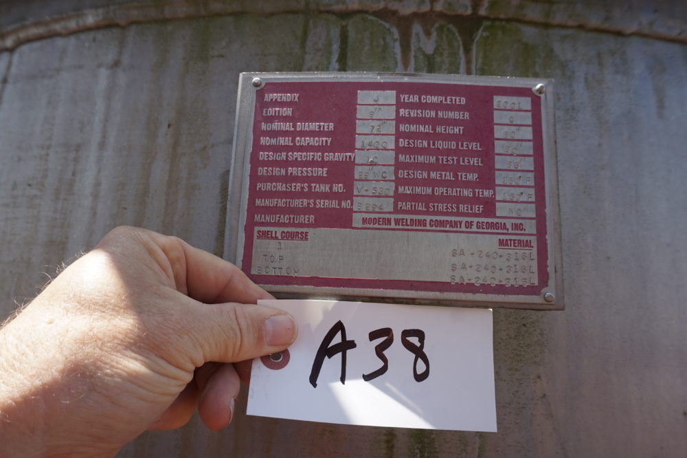 LOT# A38: Process vessel with 3 sightglasses, 1400 gallon capacity, 316L Stainless Steel.
