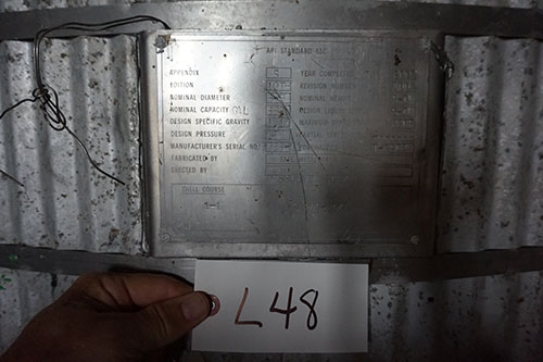 Storage tank, 20 foot tall, 12 foot diameter, capacity 12,720 gallons.